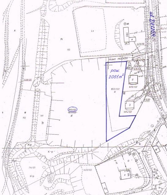 Charakterystyka: Nieruchomość niezabudowana przeznaczona pod zabudowę mieszkaniową jednorodzinną, zgodnie z zapisami wyżej wym. miejscowego planu zagospodarowania przestrzennego. Działka posiada kształt nieregularny, znajduje się na niej ogrodzenie wykonane przez dotychczasowego dzierżawcę, rosną na niej wysokie drzewa, a w południowo – zachodniej części działki znajduje się skarpa porośnięta drzewami. Nieruchomość położona jest w rejonie ul. Długiej, w drugiej linii zabudowy za Nr 192-192A, nie posiada bezpośredniego dostępu do drogi publicznej ul. Długiej. Przy jej zbyciu zostanie ustanowione dla niej prawo przejazdu po gruncie sąsiednim tj. po działce gminnej nr 1813/122. Na terenie planowanego wjazdu od strony ul. Długiej (przy granicy z działką nr 1675/122) znajduje się słup transformatorowy, a za nim uskok terenu, a następnie od strony północnej znajduje się skarpa nachylona w kierunku południowym (spadek terenu ok. 2m). Na terenie dojazdu rosną wysokie drzewa i samosiejki kolidujące z wjazdem do działki nr 1812/122. Nabywca zobowiązany będzie we własnym zakresie i na własny koszt: dokonać wycinki istniejących drzew i krzewów kolidujących z wjazdem; zniwelować teren i wybudować mur oporowy od strony północnej (w przeciwnym wypadku nastąpi osunięcie się sąsiedniego gruntu prywatnego). Ponadto nabywca zobowiązany będzie na własny koszt na działce nr 1812/122: