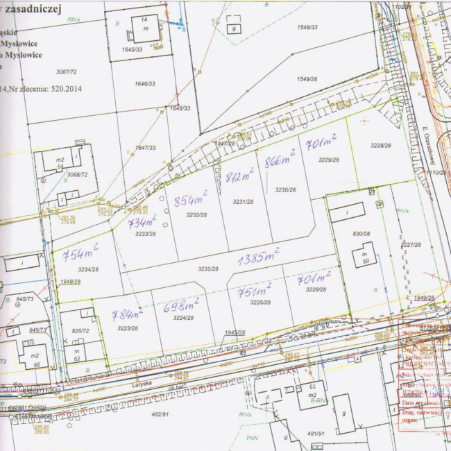 Charakterystyka: Działki niezabudowane przeznaczone pod budownictwo mieszkaniowe jednorodzinne. Na terenie zbywanych działek występują znaczne różnice wysokości, teren nachylony w kierunku północnym zakończony skarpą. Część nieruchomości porośnięta jest samosiejkami drzew i krzewów - wymaga uporządkowania oraz dokonania wycinki drzew kolidujących z planowaną zabudową działek. Wzdłuż południowej granicy działek: nr 3223/28, nr 3224/28, nr 3235/28, nr 3225/28 i nr 3226/28 przebiega podziemna sieć teletechniczna, a przez działki nr 3225/28 i nr 3226/28 dodatkowo podziemna sieć energetyczna. Na działce nr 3230/28 (w północno-zachodnim narożu) znajduje się nieczynny słup oświetleniowy. Powyższe uzbrojenie terenu w niewielkim stopniu utrudnia zagospodarowanie nin. działek. Nabywcy zobowiązani będą zapewnić właścicielom sieci dostęp do sieci, celem przeprowadzenia konserwacji lub usunięcia awarii. Przedmiotowe działki mogą być wykorzystana pod zabudowę z zastrzeżeniem, że projektowane obiekty budowlane nie mogą naruszać istniejącego uzbrojenia terenu i przy ich lokalizacji zostaną zachowane odpowiednie odległości od sieci. W przypadku gdyby jednak projektowana zabudowa kolidowała z przebiegającymi sieciami, nabywcy zobowiązani będą na własny koszt dokonać przełożenia sieci, po uzgodnieniu z ich gestorami. Obsługa komunikacyjna wyżej wym. działek będzie się odbywać od ul. Laryskiej, po działce gminnej nr 3235/28, przeznaczonej pod wewnętrzną ogólnodostępną drogę dojazdową, której nadano nazwę ul. Piotra Korusa. Lokalizację zjazdu nabywcy uzgodnią z zarządcą drogi w odrębnym postępowaniu. Zagospodarowanie nieruchomości nastąpi na podstawie szczegółowych warunków, które zostaną określone na wniosek nabywcy w decyzji o warunkach zabudowy. Zbywane działki znajdują się na obszarze terenu górniczego, w związku z czym przy ustalaniu warunków zabudowy, konieczne będzie uzyskanie stanowiska właściwego państwowego organu nadzoru górniczego.
