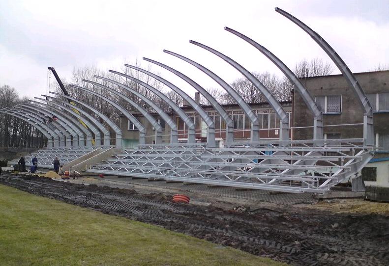 - budowa czterosegmentowej zadaszonej trybuny z 504 miejscami siedzącymi wraz z oświetleniem i odwodnieniem,