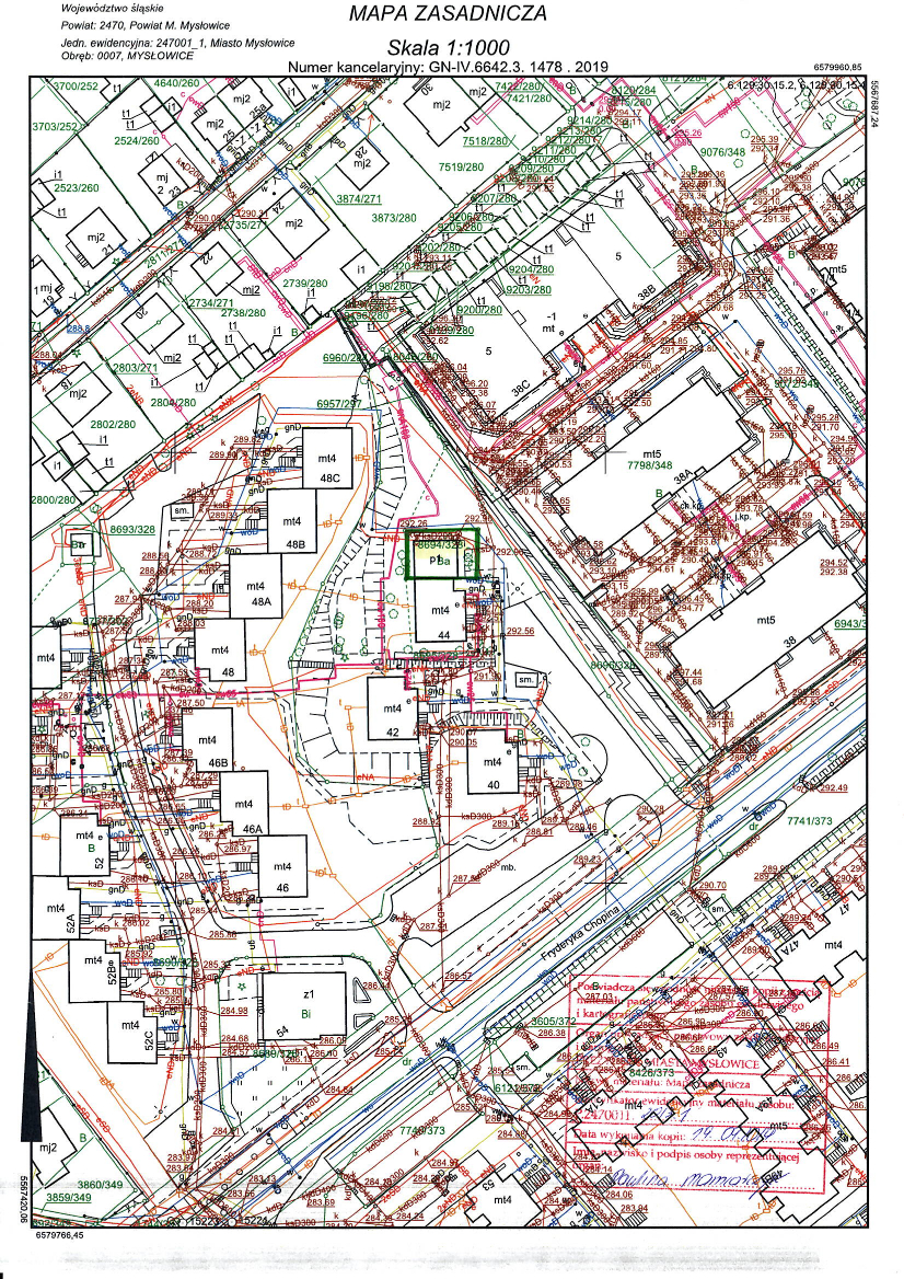 1. Zbywana działka posiada kształt prostokąta o wymiarach: ok. 11,3 m szerokości i ok. 17 m długości, na której znajduje się budynek nieczynnej wymiennikowni ciepła, bezpośrednio przylegający do północnej ściany budynku Nr 44 przy ul. Szopena. Na nieruchomości znajdują się studzienki kanalizacyjne oraz przebiegają sieci uzbrojenia podziemnego terenu: energetyczna, wodociągowa i kanalizacyjna. Nabywca zobowiązany będzie zapewnić właścicielom sieci dostęp do sieci i urządzeń, celem przeprowadzenia konserwacji lub usunięcia awarii. Planowane zagospodarowanie nieruchomości nie może naruszać istniejącego uzbrojenia podziemnego terenu, a w przypadku gdyby jednak kolidowało z przebiegającymi sieciami i urządzeniami, nabywca dokona ich przełożenia na własny koszt, po uzgodnieniu z gestorami sieci.