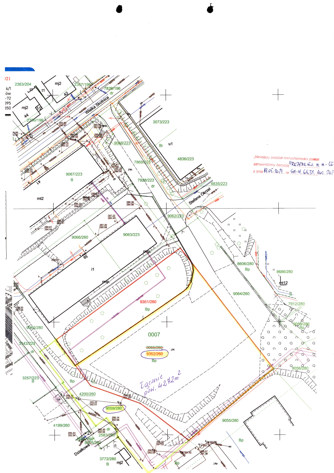 1. Działki nr 9352/260 i nr 9059/280 są niezabudowane, położone w Mysłowicach w rejonie ul. Wielkiej Skotnicy i ul. Działkowej, przeznaczone do sprzedaży łącznie jako jedna zorganizowana całość gospodarcza o ogólnej pow. 4272 m2, z przeznaczeniem na cele zgodne z zapisami wyżej wym. Studium. Zbywana nieruchomość posiada kształt wielokąta. Teren nieruchomości jest częściowo pokryty asfaltem, a w pozostałej części porośnięty zielenią nieurządzoną. Na części nieruchomości znajdują się skarpy oraz gruz budowlany, a przy granicy nieruchomości występują kolidujące sieci uzbrojenia technicznego (kanalizacja ogólnospławna i deszczowa, studzienki kanalizacyjne, sieci ciepłownicze c.o. o wysokich parametrach, komora ciepłownicza), które nie mają negatywnego wpływu na możliwości zagospodarowania nieruchomości. Nin. grunt może być wykorzystany pod zabudowę z zastrzeżeniem, że projektowane obiekty budowlane nie mogą naruszać istniejącego uzbrojenia podziemnego terenu i przy ich lokalizacji zostaną zachowane odpowiednie odległości od sieci i urządzeń uzbrojenia terenu. Nabywca zobowiązany będzie zapewnić właścicielom sieci dostęp do sieci i urządzeń, celem przeprowadzenia konserwacji lub usunięcia awarii. W przypadku gdyby jednak projektowana zabudowa kolidowała z przebiegającymi sieciami, nabywca dokona ich przełożenia na własny koszt, po uzgodnieniu z gestorami sieci. Na części zbywanej działki nr 9059/280, wzdłuż wschodniej jej granicy z sąsiednią działką nr 9351/260, znajduje się fragment ogrodzenia placu rekreacji i wypoczynku, który zlokalizowany jest na działce gminnej nr 9351/260 (ogrodzenia znajduje się ok. 15 cm od granicy). Nabywca własnym staraniem i na własny koszt przesunie fragment istniejącego ogrodzenie do granic w/w nieruchomości, po wcześniejszym uzgodnieniu z właścicielem działki nr 9351/260.