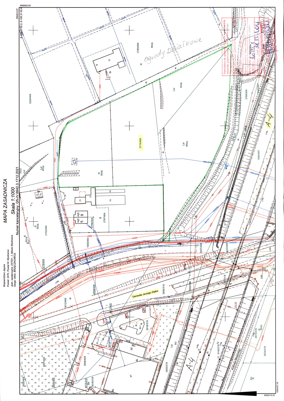 Zbywana nieruchomość posiada nieforemny kształt, częściowo porośnięta jest samosiejkami i drzewami. Od strony wschodniej graniczy z ogródkami działkowymi, od zachodu działkę ogranicza ul. Gen.J.Ziętka, a od południa w bliskim sąsiedztwie przebiega autostrada A4. Przez nieruchomość w kierunku południowo – północnym przebiega sieć magistrali wodociągowej woD1600, dla której ustalono strefę ochronną 10 mb z obu stron sieci. Ponadto w granicach działki, we fragmencie przy drodze dojazdowej, przebiegają dwie sieci wodociągowe oraz energetyczna. Przedmiotowa nieruchomość może być wykorzystana pod zabudowę z zastrzeżeniem, że projektowane obiekty budowlane nie mogą naruszać istniejącego uzbrojenia podziemnego terenu i przy ich lokalizacji zostaną zachowane odpowiednie odległości od sieci i urządzeń, zgodnie z obowiązującymi przepisami. W przypadku, gdyby jednak projektowana zabudowa kolidowała z przebiegającą siecią nabywca zobowiązany będzie we własnym zakresie i na własny koszt opracować projekt niezbędnej jej przebudowy lub zabezpieczenia, w uzgodnieniu z właścicielem sieci. Obsługa komunikacyjna ww. nieruchomości odbywa się z drogi publicznej DW 934 ul. Gen. Jerzego Ziętka przez ogólnodostępną wewnętrzną drogę dojazdową. Droga DW 934 w rejonie działki 3714/404 jest nieograniczona tonażowo, jak również ogólnodostępna droga wewnętrzna w chwili obecnej nie posiada ograniczenia tonażowego. Jednakże w przypadku zwiększenia natężenia ruchu oraz zmiany struktury rodzajowej pojazdów niezbędne będzie przeprowadzenie badań konstrukcji nawierzchni i nośności drogi wewnętrznej. W zależności od wyniku powyższych badań konieczne może być wprowadzenie ograniczenia tonażowego lub dostosowanie obecnej konstrukcji drogi do wykorzystywania jej przez pojazdy o zwiększonym tonażu. Lokalizację zjazdu z drogi publicznej nabywca uzgodni we własnym zakresie z zarządcą drogi w odrębnym postępowaniu.