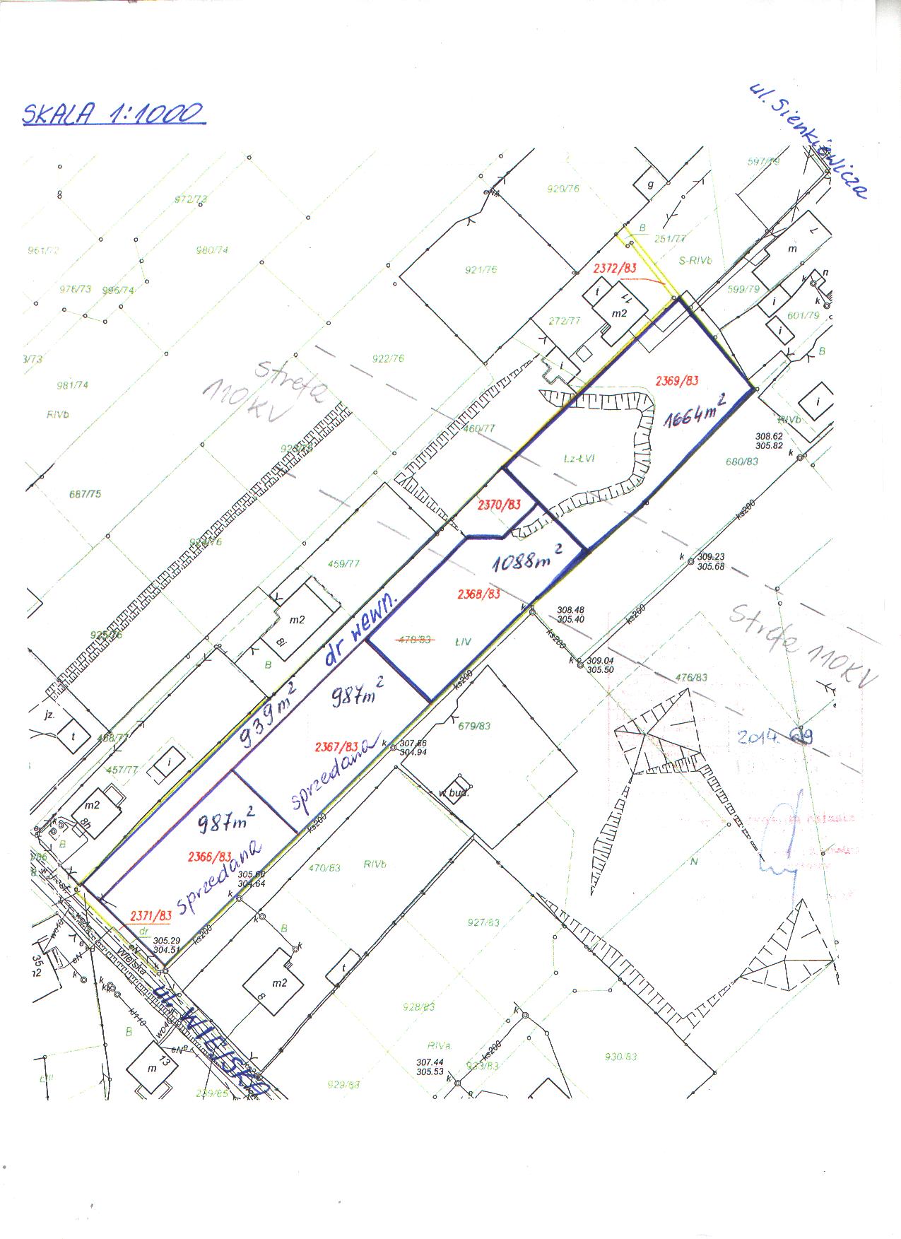 Charakterystyka: Działki niezabudowane przeznaczone pod zabudowę na cele zgodne z zapisami wyżej wym. miejscowego planu zagospodarowania przestrzennego. Zbywane działki posiadają kształt foremny. Teren działek jest płaski, za wyjątkiem działki nr 2369/83, na której znajduje się zagłębienie terenu porośnięte wysoką roślinnością, co wskazuje, że przy obfitych opadach deszczu mogą się tam gromadzić wody opadowe. Zagłębienie to koliduje z planowanym na nin. działkę wjazdem – działka nr 2369/83 wymaga wyrównania i uporządkowania. Ponieważ planowana do zbycia działka nr 2368/83 znajduje się w sąsiedztwie działki nr 2369/83, nabywcy obu działek zobowiązani będą we własnym zakresie i na własny koszt wykonać badanie geotechniczne gruntu, celem sprawdzenia poziomu wód gruntowych i możliwości zabudowy działek. W przypadku konieczności dokonania odwodnienia działek, nabywcy zobowiązani będą wykonać je na własny koszt. Wzdłuż południowej granicy działki nr 2368/83 (poza działką) przebiega sieć kanalizacji sanitarnej. We wschodniej granicy działek nr 2368/83 i nr 2370/83 przebiega napowietrzna linia energetyczna wysokiego napięcia 110 kV, dla której strefa ochronna wynosi po 15 m z obu stron sieci. Strefa ochronna od nin. sieci zachodzi również na zachodnią część działki nr 2369/83. W północno-wschodnim narożu działki nr 2369/83 przebiega również sieć gazowa i wodociągowa – przyłącze do budynku Nr 11 przy ul. H.Sienkiewicza. Nin. grunty mogą być wykorzystane pod zabudowę z zastrzeżeniem, że projektowane obiekty budowlane nie mogą naruszać istniejącego uzbrojenia podziemnego oraz nadziemnego terenu i przy ich lokalizacji zostaną zachowane odpowiednie odległości od sieci. Nabywcy zobowiązani będą zapewnić właścicielom sieci dostęp do sieci, celem przeprowadzenia konserwacji lub usunięcia awarii. Obsługa komunikacyjna działek: nr 2368/83 i nr 2369/83 będzie się odbywać z ul. Wiejskiej, poprzez działkę nr 2370/83, wydzieloną pod wewnętrzną drogę dojazdową m.in. do tych działek. Lokalizację zjazdu z ul. Wiejskiej nabywcy uzgodnią z zarządcą drogi w odrębnym postępowaniu. Działki wym. w poz. 1 i 2, przeznaczone pod zabudowę mieszkaniową, zostaną sprzedane wraz z udziałem 1/4 części w działce nr 2370/83, przeznaczonej pod drogę dojazdową. Zbywane działki znajdują się na obszarze terenu górniczego, w związku z czym wznoszenie trwałych budowli i urządzeń, zgodnie z zapisami planu miejscowego, wymaga uzgodnienia z właściwym organem państwowego nadzoru górniczego.